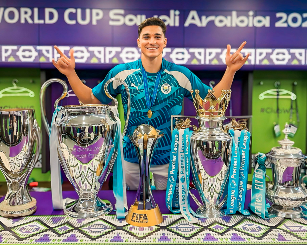 Álvarez ya se había coronado campeón del mundo con la selección argentina en el Mundial de Qatar 2022, donde se destacó como una de las revelaciones del torneo y forjó una dupla letal con Lionel Messi. Previamente, en 2021, había obtenido la Copa América con la albiceleste, venciendo a Brasil en la final.